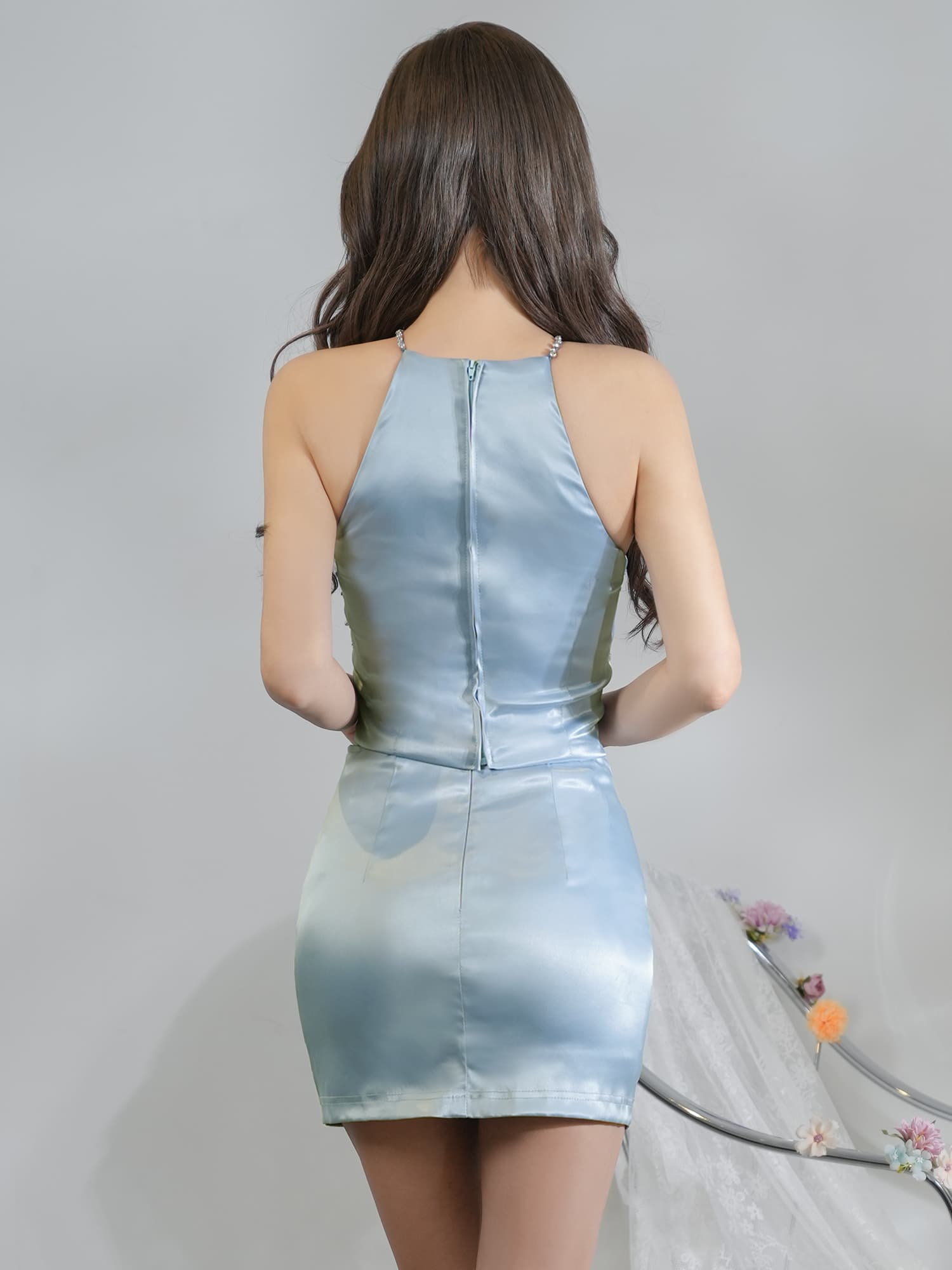 光沢感のあるサテン生地に繊細なビジュー装飾を重ね、上半身に華やかな輝きを集めたラグジュアリーなセットアップ。