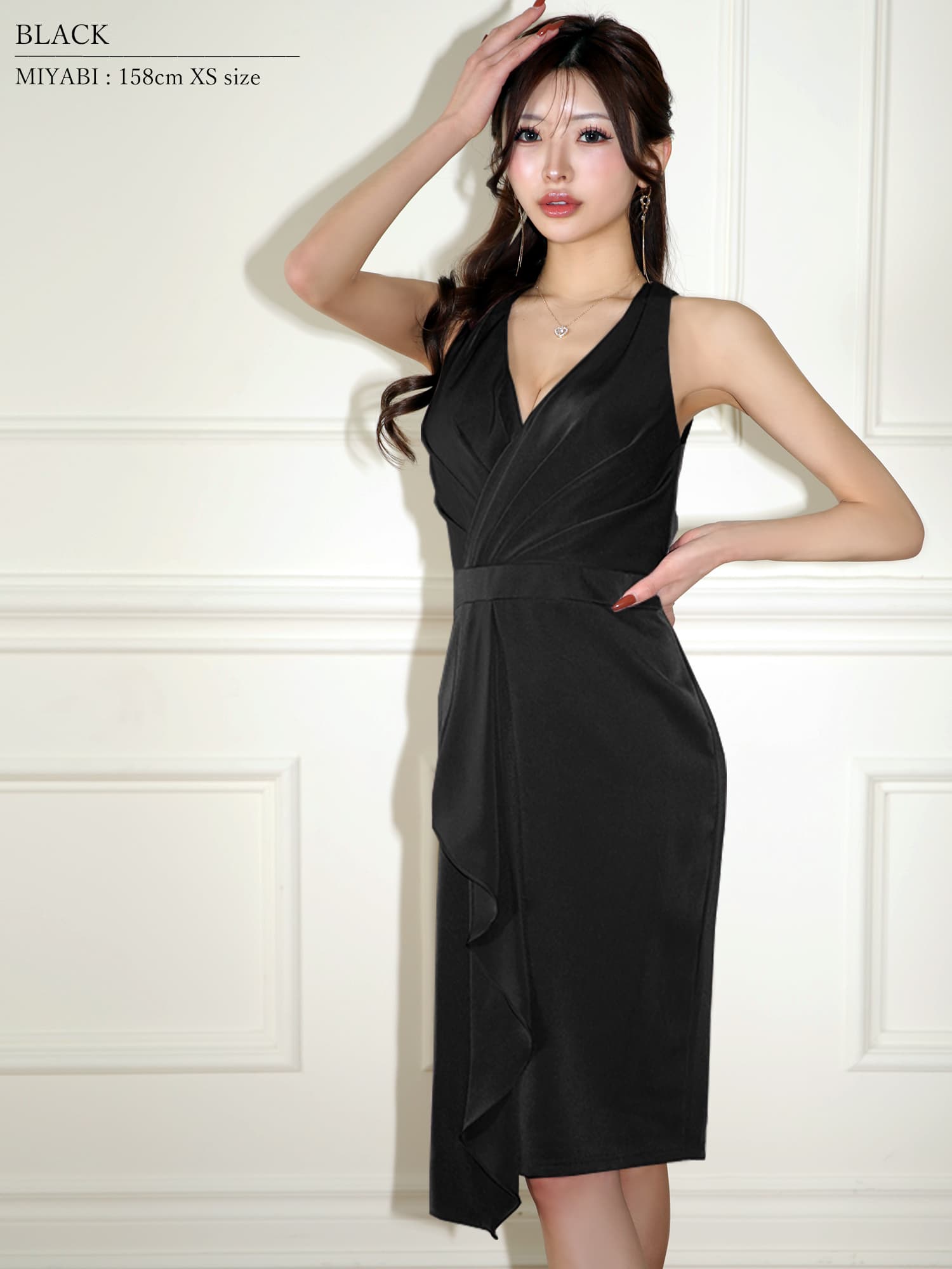 【予約商品/5月中旬-5月下旬発送予定】XSサイズあり【Veautt/ヴュート】バストVカット/ タック/ ウエストマーク/ フリルデザイン/ タイト/ ミディアムドレス/ キャバドレス[OF05]