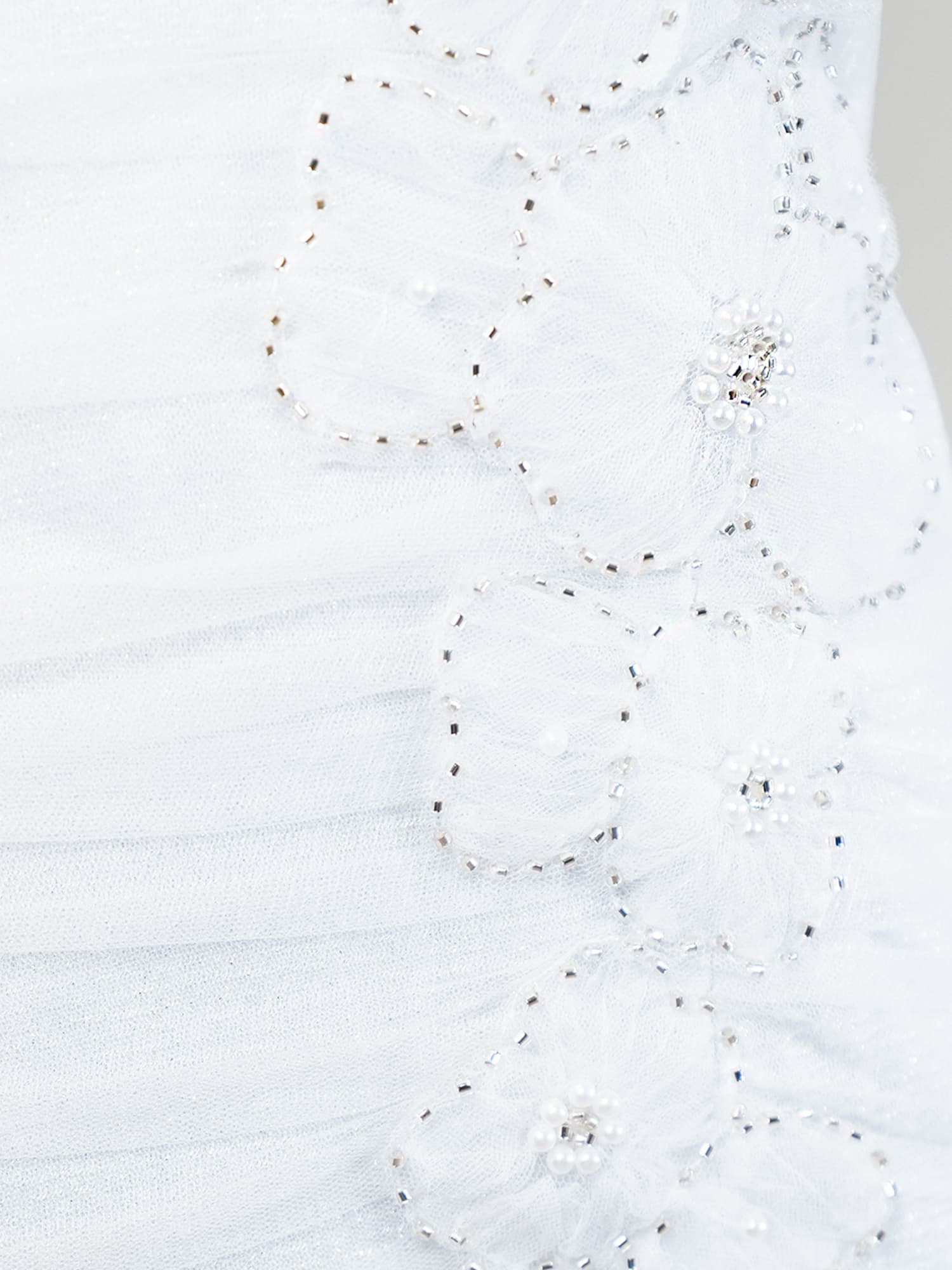 胸元からウエストにかけて施された立体フラワー刺繍とビジューが、動くたびにさりげなく輝き華やかさをプラス。