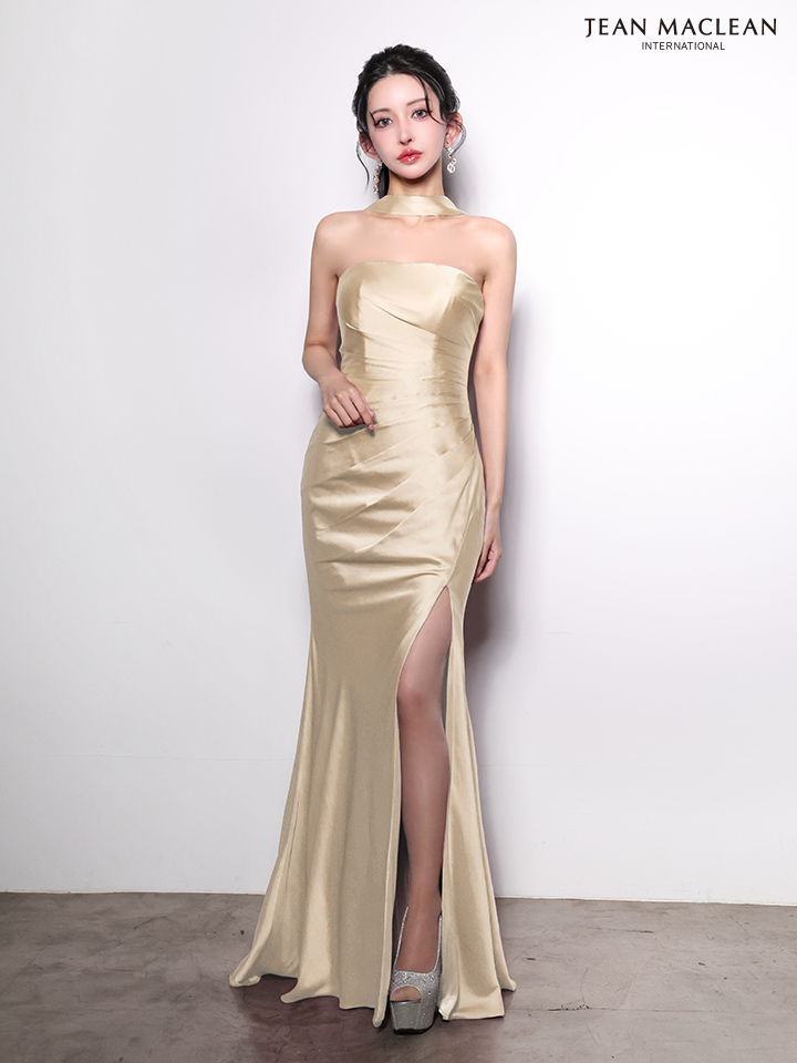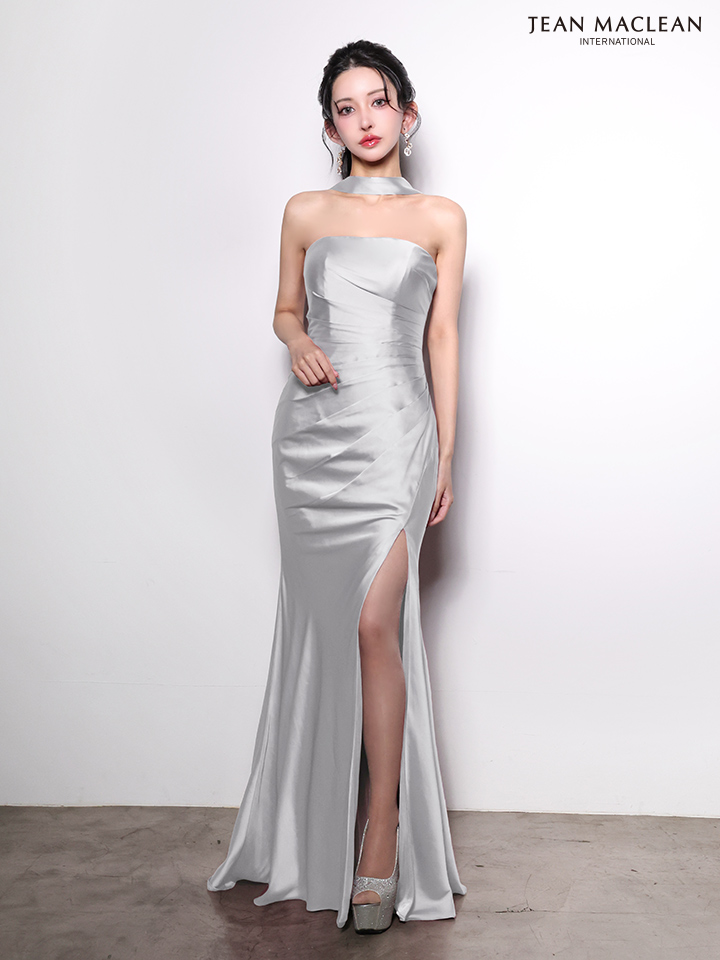 ベアデザインがデコルテラインを美しく強調し、ロングスリットで美脚アピールも◎