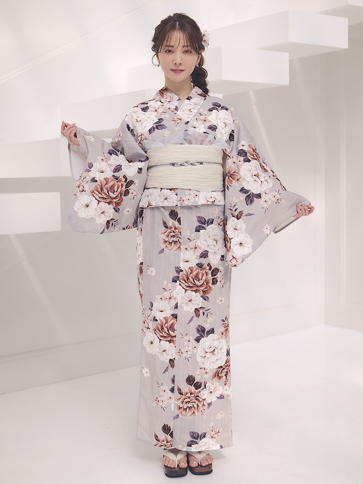 送料無料!【即日発送】ニュアンスグレーピオニー浴衣【浴衣3点セット 浴衣/帯/下駄】[OF04] [Y-9418-ok-GY-F-26MR-260427]