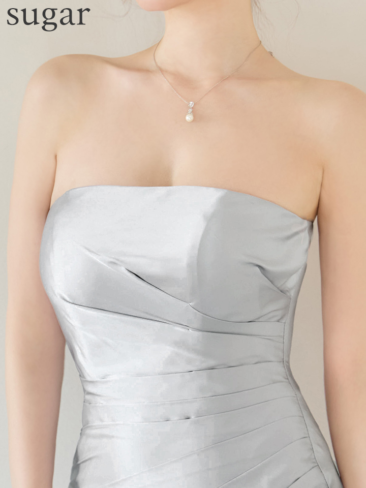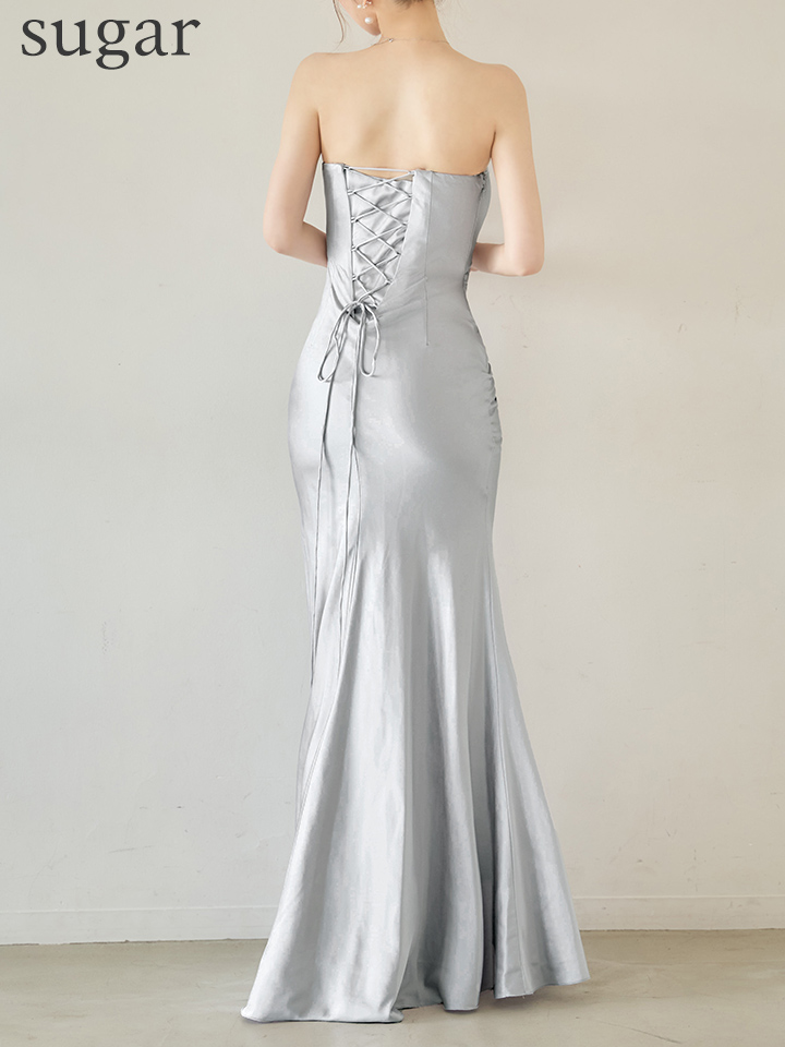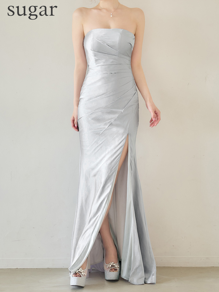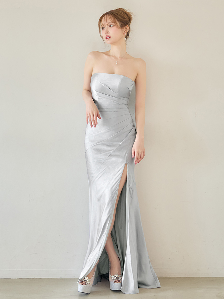 ベアデザインがデコルテラインを美しく強調し、ロングスリットで美脚アピールも◎