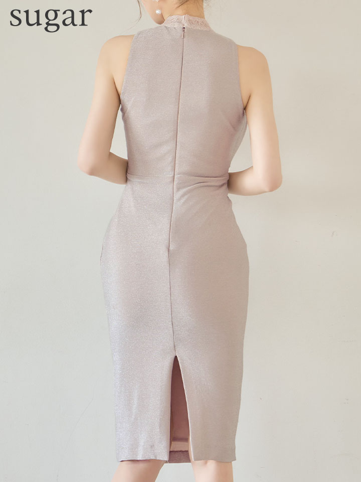 XSサイズあり【JEAN MACLEAN/ジャンマクレーン】ドレープ/ ラメニット/ レース/ ハイネック/ ノースリーブ/ ひざ丈/ スリット/ タイト/ ミディアムドレス/ キャバドレス[OF2A]