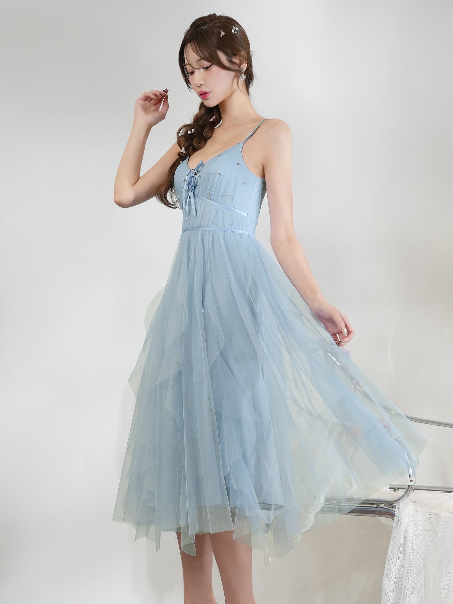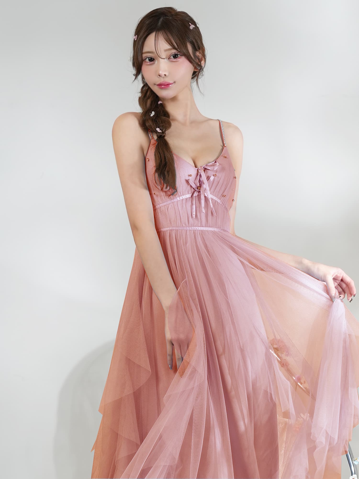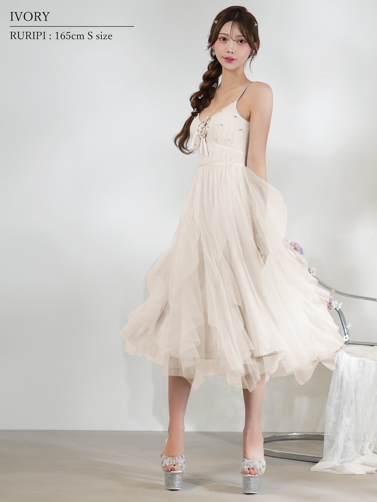 軽やかなチュールを重ねたエアリーなシルエットが、女性らしさを引き立てる一着。