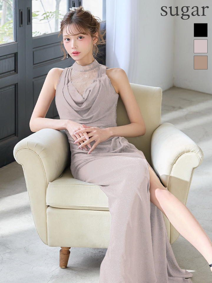 【JEAN MACLEAN/ジャンマクレーン】ドレープ/ タック/ ラメニット/ レース/ ノースリーブ/ ハイネック/ スリット/ タイト/ ロングドレス/ キャバドレスlong[OF2A]