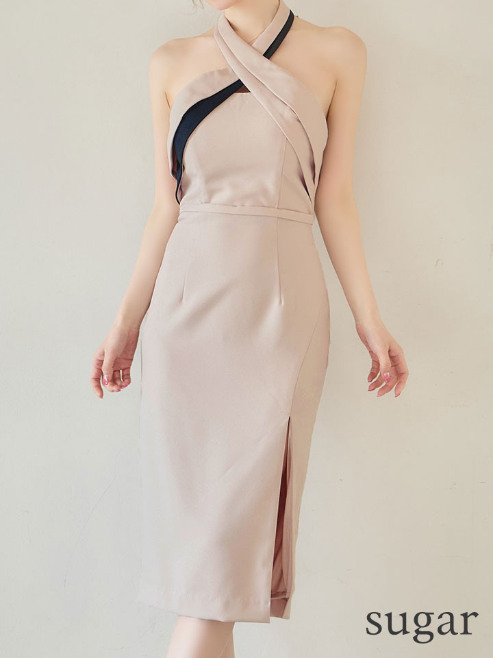 クロスネックのホルターデザインが視線を惹きつける、モードなミディアムドレス♡