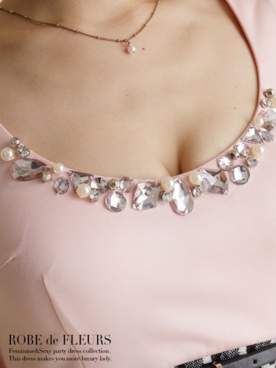 深めに開いたラウンドネックにキラキラビジューがデコルテを美しく魅せます♪♪