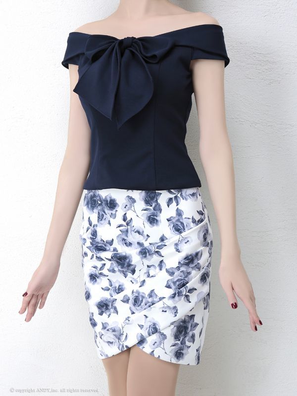 【an】胸元リボン/オフショル/セットアップ/キャバドレス ネイビーxフラワープリント[OF05] [AOC2480NVxFlowerprint]