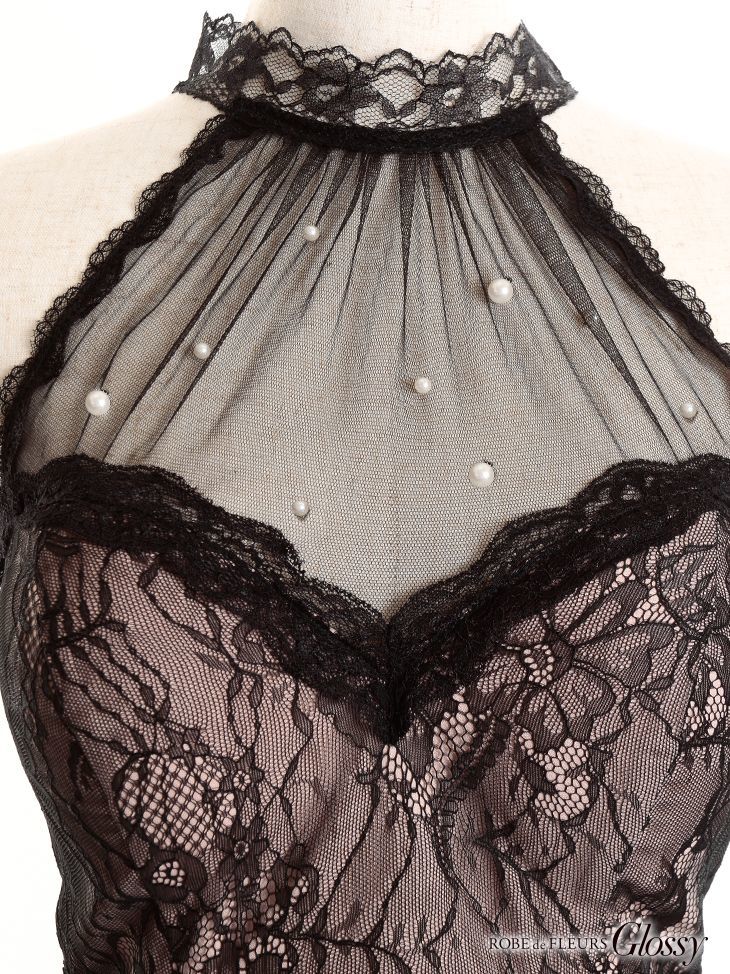 チュールのホルターネックから肌が透けてセクシーな印象。