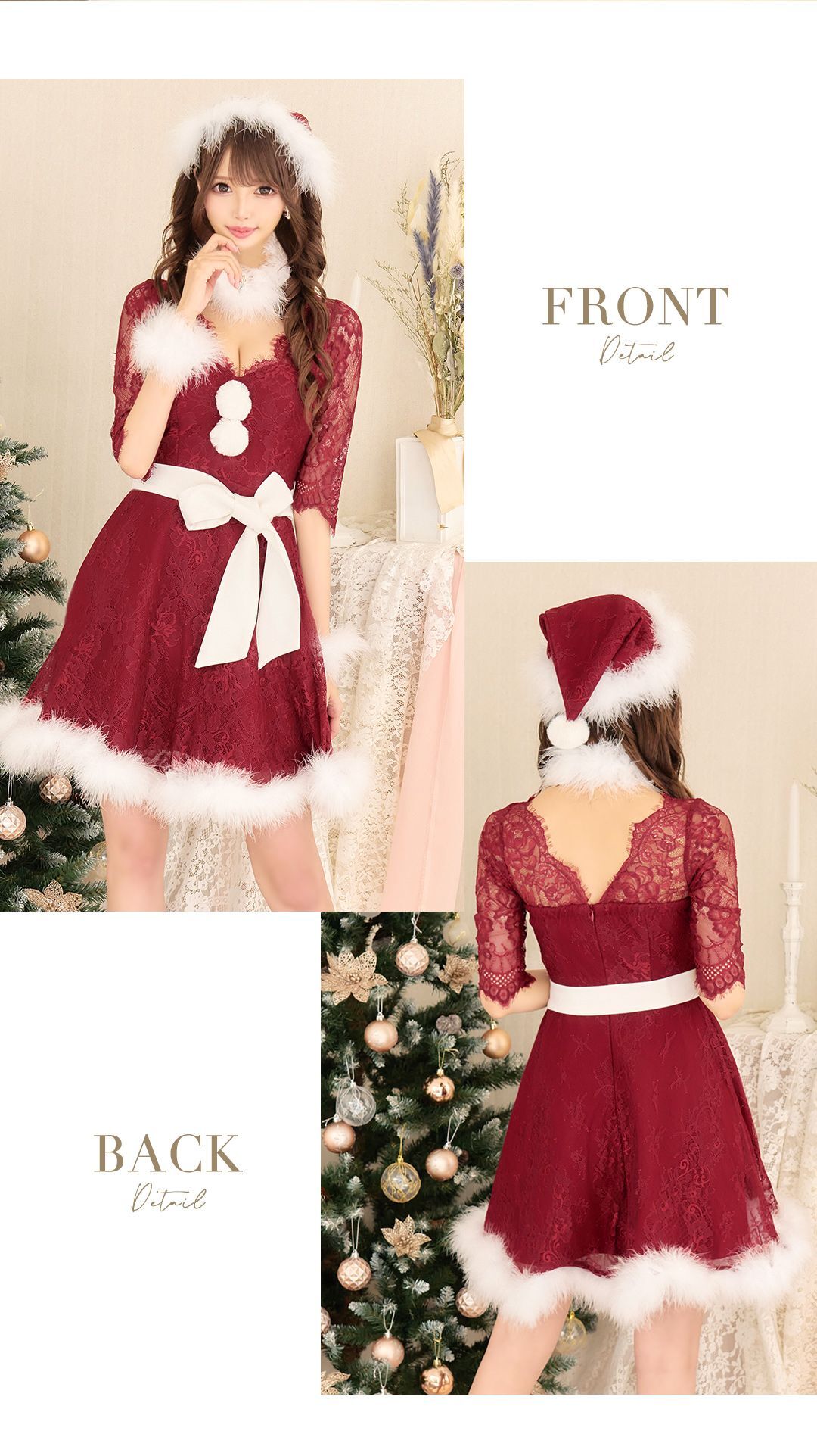 深みのあるグラマラスなワインレッドの総レースをふんだんに使用したフレアドレスサンタ。