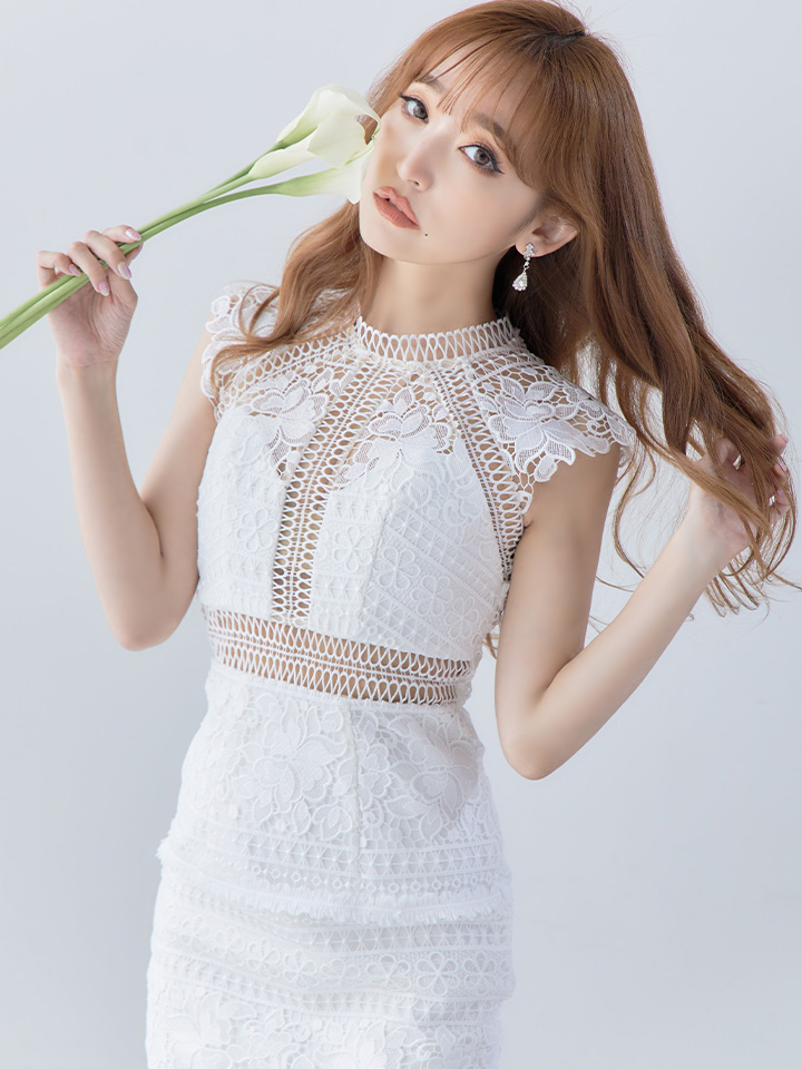 繊細なデザインレース刺繍がラグジュアリーなミディアム丈ドレス