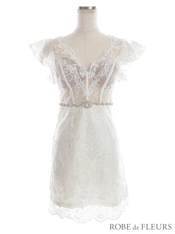 XS?Lサイズあり【ROBE de FLEURS/ローブドフルール】ウエストビジュー/ シースルーレース/ フリルスリーブ/ 台形スカート/ ミニドレス/ キャバドレス ピンク[OF08] [fm2632-P-S2207]