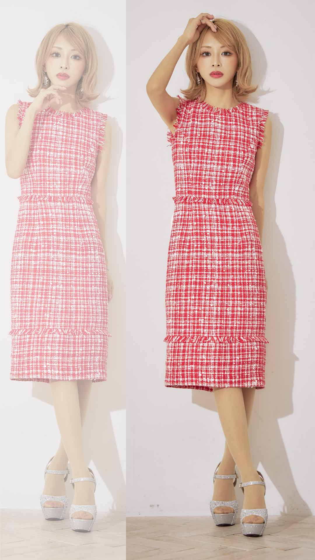 門りょうちゃん着用【XS-Lサイズあり】【ERUKEI エルケイ】ツイード/ フリンジ/ ノースリーブ/ タイト/ ワンピース/ ミディアムドレス/ キャバドレス[OF2] [LKE2628-R-S2211]