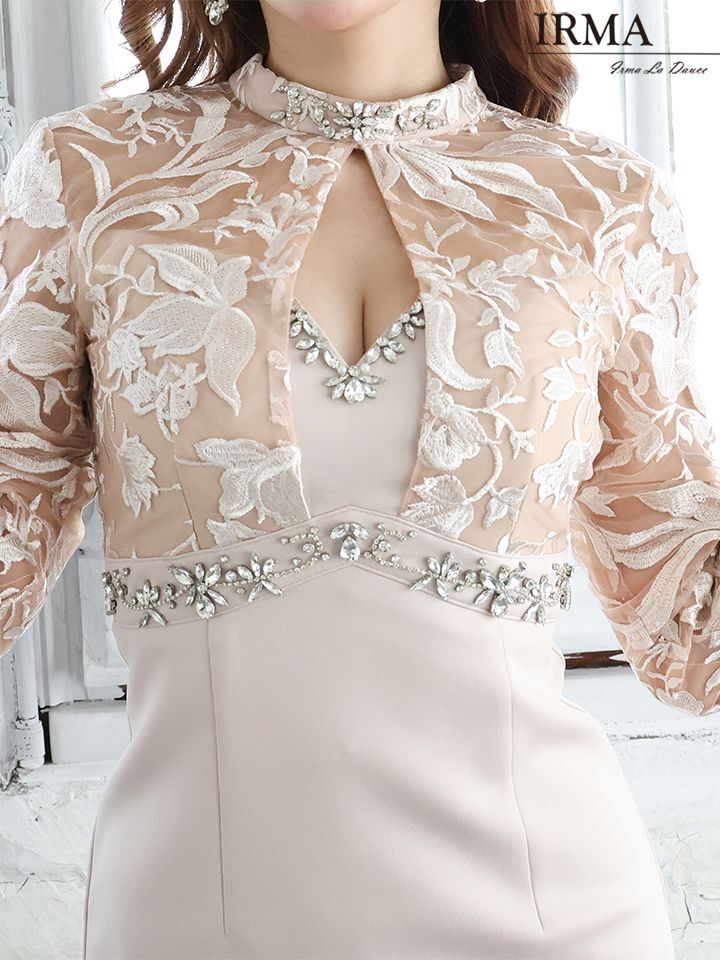 Lサイズあり☆【IRMA/イルマ】長袖/ 袖あり/ パフスリーブ/ レース/ 刺繍/ カットアウト/ ビジュー/ タイト/ ミニドレス/ キャバドレス【HC02】