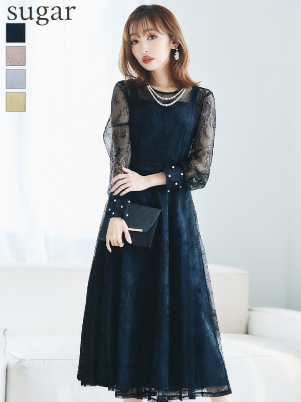 エレガントな総レースが女性らしいミモレ丈ワンピースドレス