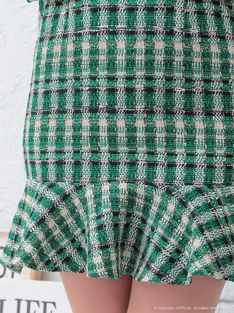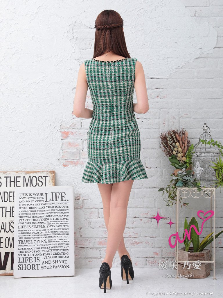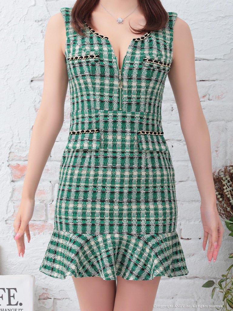 【an/アン】チェックツイード/ ノースリーブ/ フロントジップ/ 裾フリル/ タイト/ ミニドレス/ キャバドレス[OF05] [AOC3351-GR-2212]