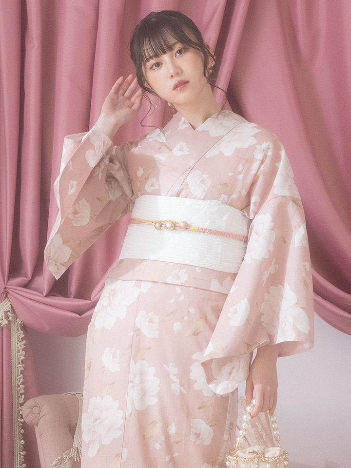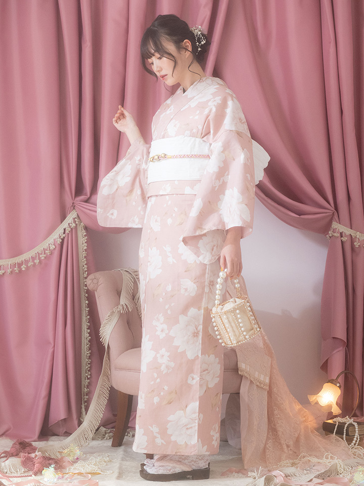 【即日発送】【浴衣】くすみピンク地のホワイト牡丹浴衣 【浴衣3点セット 浴衣/帯/下駄】[OF04]