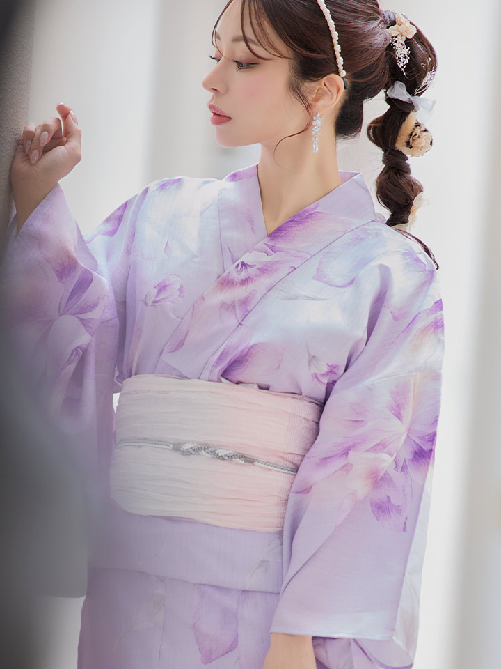 淡いストライプが描かれた生地に大輪のグラデーションフラワーが鮮やかに彩る、華やかさたっぷりの大人浴衣。セットのしわ帯もグラデーションでまとめるのがポイント♡