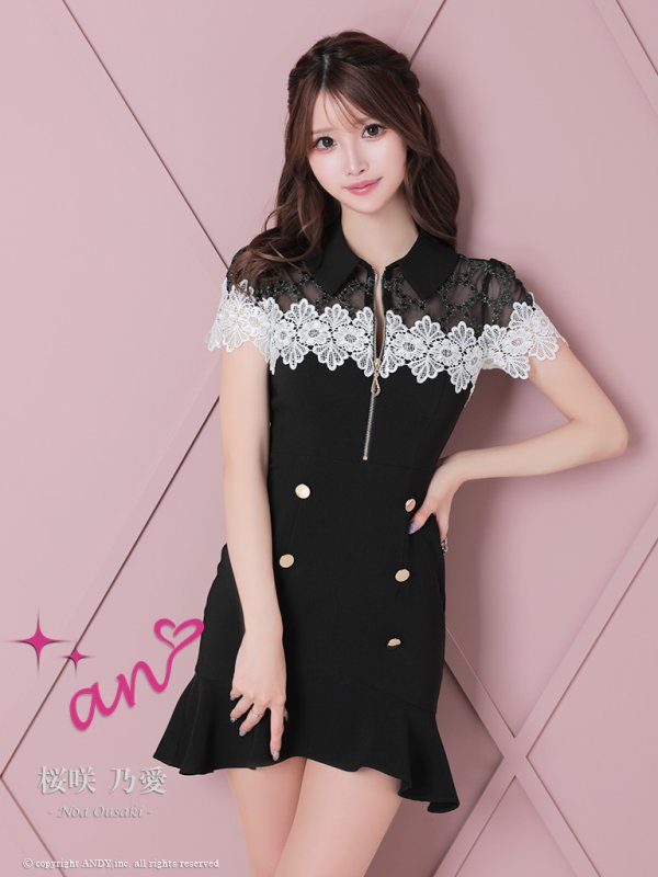 【an /アン】襟付き/ フロントジップ/ マーメイド / レース切替/ ボタンデザイン/ 裾フリル/ ミニドレス/ キャバドレス[OF05]