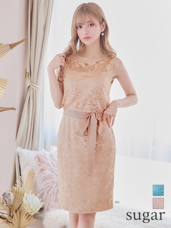 - > XS-Lサイズあり【ERUKEI エルケイ】刺繍レース/ リボンベルト/ ノースリーブ/ タイト/ 膝丈/ ミディアムドレス/ キャバドレス[OF2]