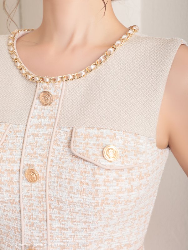 ネックラインを縁取るゴールドチェーンが高級感あるツイードミニドレス♡