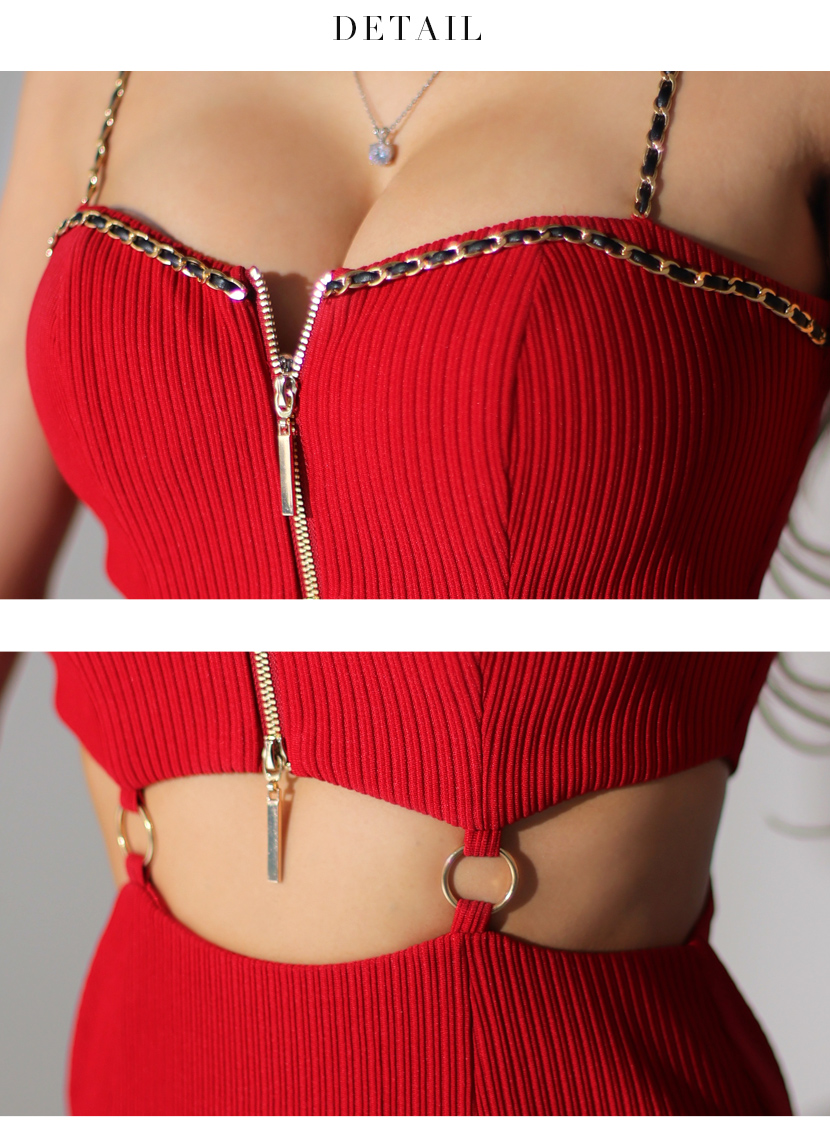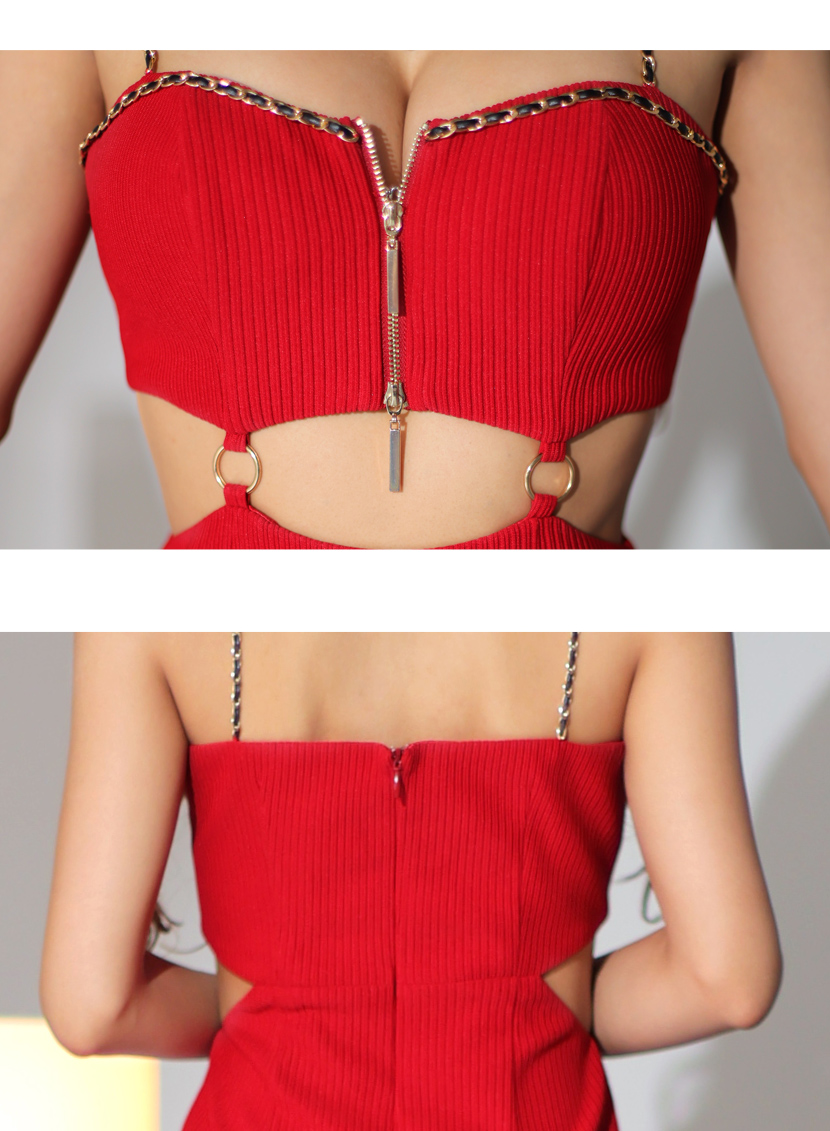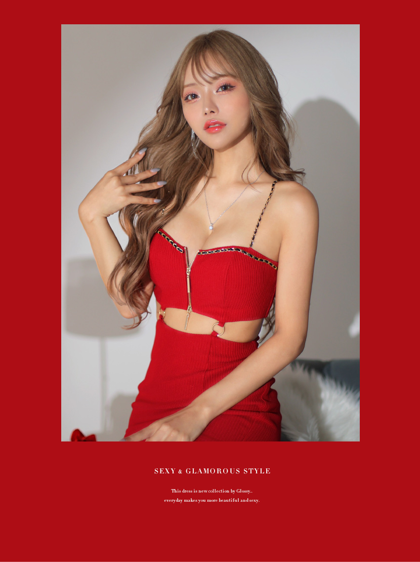 大胆なバストカットとキャミデザイン、短め丈から見えるウエストもポイント。