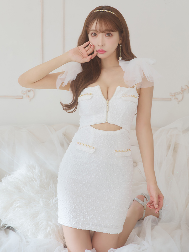 XSサイズあり【an /アン】 スパンコール/ ツイード/ ショルダーリボン/ チェーン/ フロントジップ/ カットアウト/タイト/ ミニドレス/ キャバドレス[OF05] [AOC3580-W-S231211]