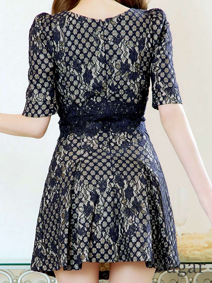 XS-Lサイズあり【Donia Quinn / ドニアクイーン】 総レース/ バストカット/ 袖あり/ パフスリーブ/ ボタンデザイン/ ボックスプリーツ/ ミニドレス/ キャバドレス[OF05] [Q60037Y-NVBE-S2312]