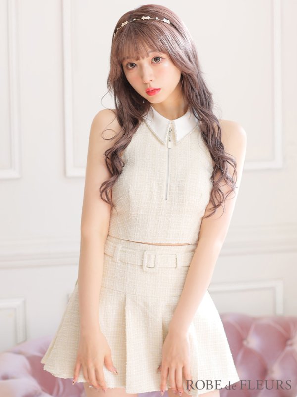 - > 【訳あり商品】※背中ほつれ有り【ROBE de FLEURS/ローブドフルール】ツイード/ ジップ/ 襟付き/ ホルター/ プリーツ/ フレア/ セットアップ/ ミニドレス/ キャバドレス[OF2]