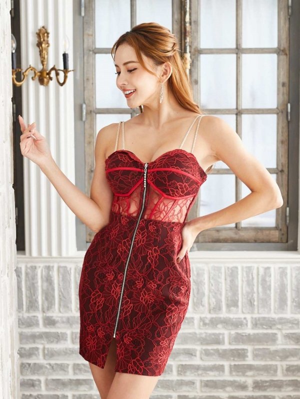 - > XLサイズあり【Alice/アリス】 フロントジップ/ フラワーレース/ シアー/ タイト/ ミニドレス/ キャバドレス【HC03】
