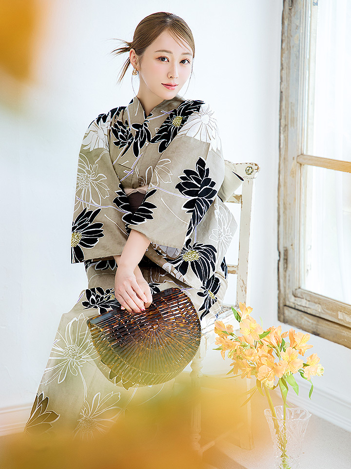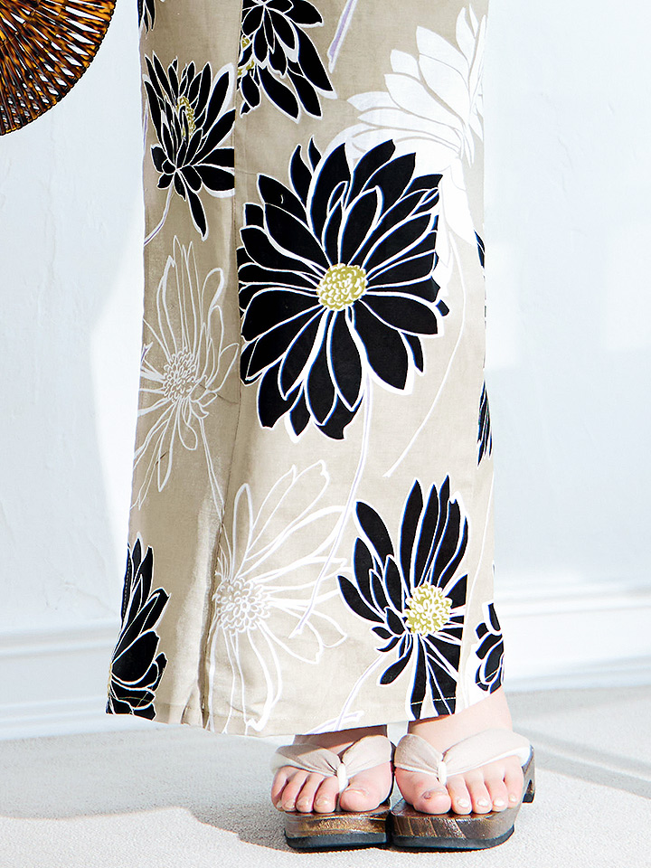 大人ベージュに大柄マーガレットが散りばめられた昭和レトロな雰囲気漂う夏浴衣。