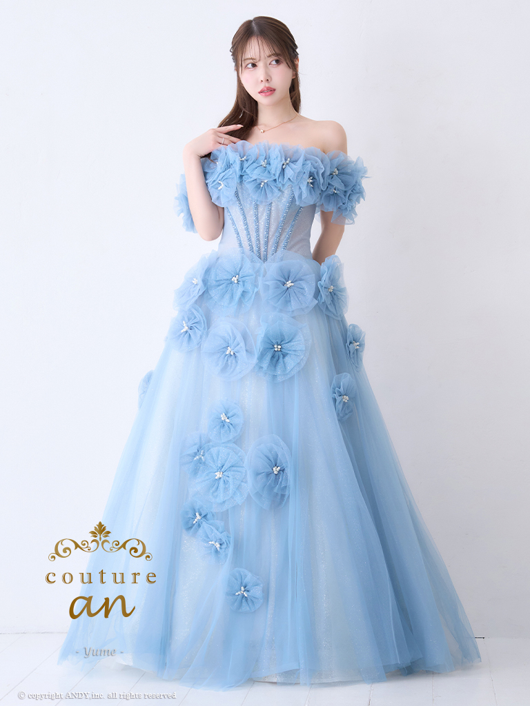 【couture an/クチュールアン】オフショルダー/ 立体フラワー/ ビジュー/ パール/ フレア/ Aライン/ プリンセス/ ロングドレス/ キャバドレス long[OF05] [AOC-WD-028-BL-2406]