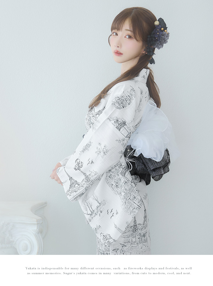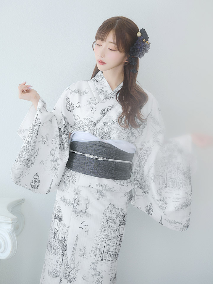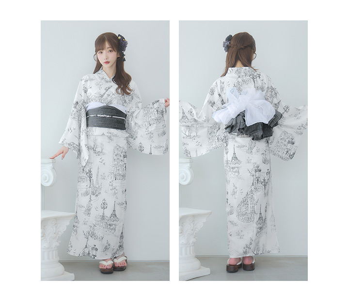 【即日発送】【Riuコラボ】白地×パリの街浴衣【浴衣3点セット 浴衣/帯/下駄】[yo/YMT] [Y-9059-nz-W-F-24RC]