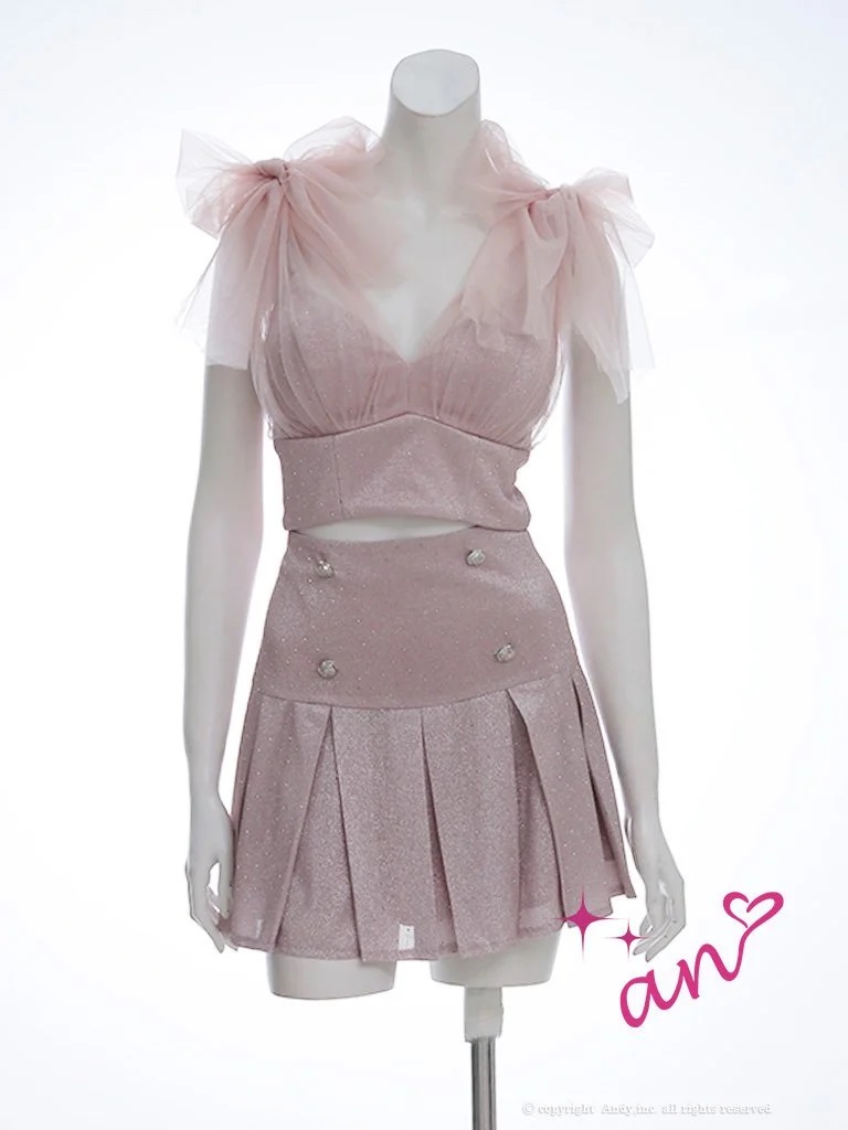 XSサイズあり【an /アン】ショルダーリボン/ ラメ/ラインストーン/ ストレッチ/ プリーツ/ フレア/ セットアップ/ ミニドレス/ キャバドレス[OF05] [AOC3708-P-S240708]