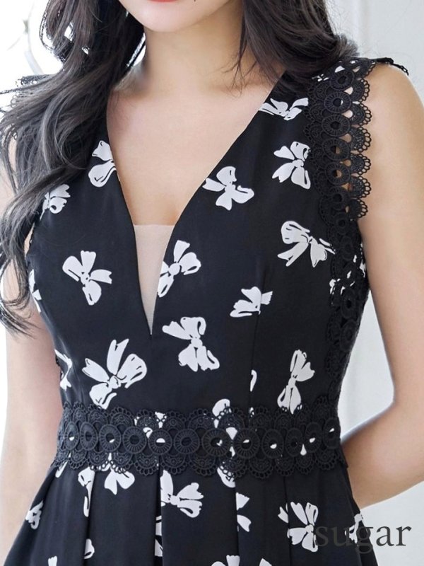 リボンプリントxレースが乙女心擽るワンピースミニドレス♡