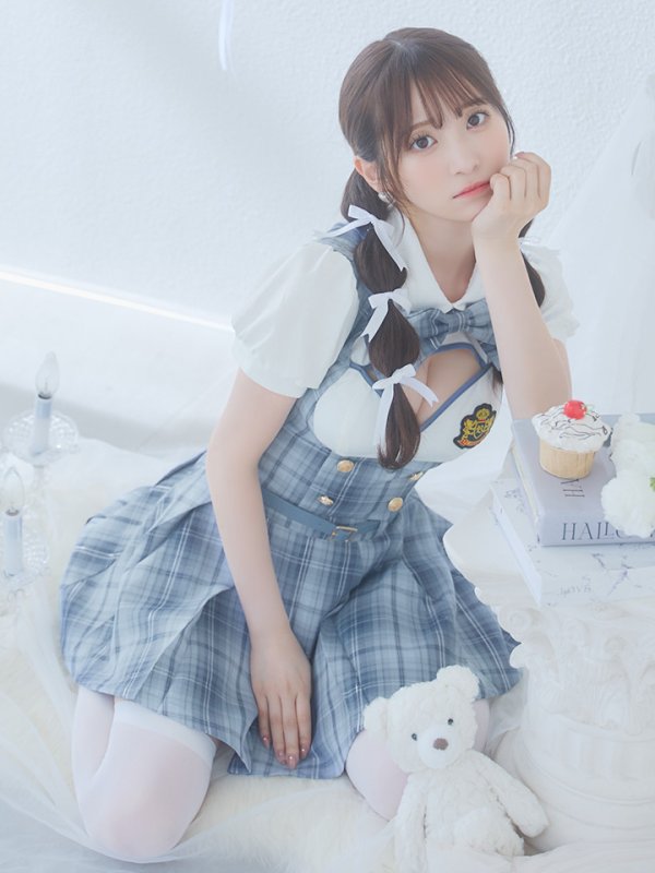 ブルーチェックが可愛い谷間強調の大人のセクシー制服コスプレ。