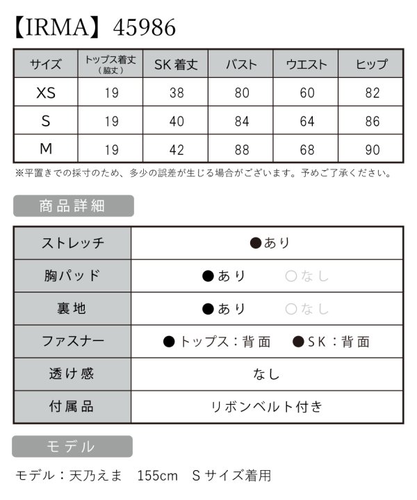 B:84 / W:64 / H:86 [着丈]トップス(脇下):約19cm スカート:約40cm |