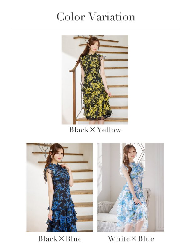 XS-Lサイズあり【SETTAN/セッタン】フラワープリント/ ティアードフリル/ プチハイネック/ 膝丈/ Aライン/ フレア/ ワンピース/ ミディアムドレス[OF2] [LKS11208-BxBL-S240905]
