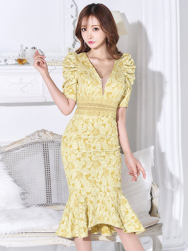マーメイドシルエットが女性らしい曲線美を強調し、パフスリーブで気になる二の腕カバーも◎