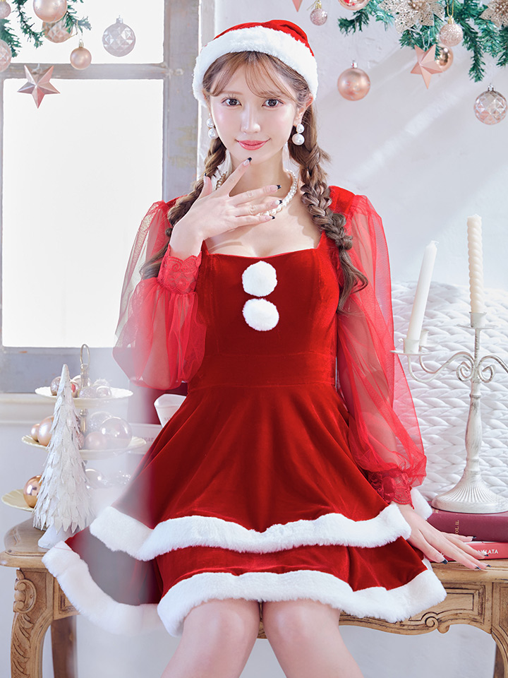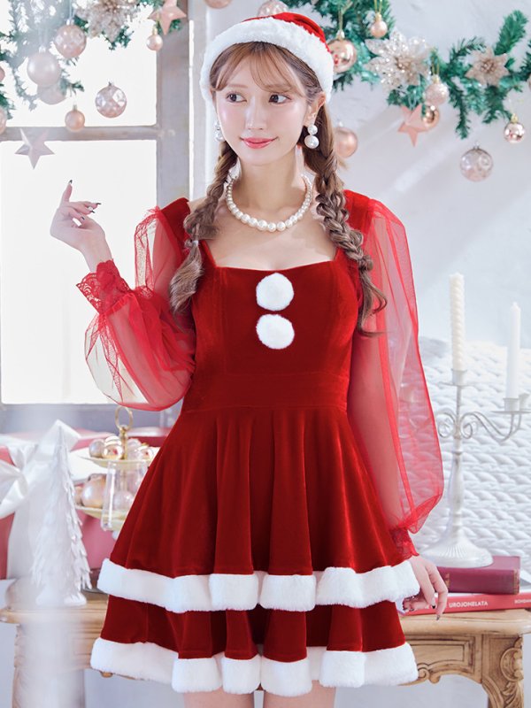 #チュール #ワンピース #長袖 #フリル #シアー #ベロア #フレア #クリスマス #パーティ #サンタコス #サンタさん