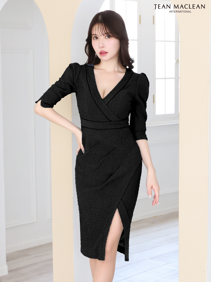 Lサイズあり【JEAN MACLEAN/ジャンマクレーン】カシュクール/ 半袖/ 袖あり/ タック/ 膝丈/ タイト/ ミディアムドレス/ キャバドレス【HC02】 [45009-JM-BLGR-2411]