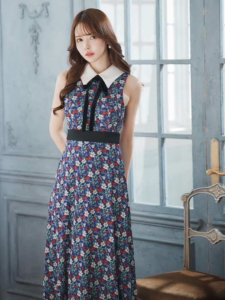 【VELIQUE/ヴェリーク】襟付き/ ネックリボン/ フラワープリント/ ノースリーブ/ フレア/ Aライン/ ワンピース/ ロングドレス/ キャバドレス long【HC02】 [BYRS-199-NV-S2411]