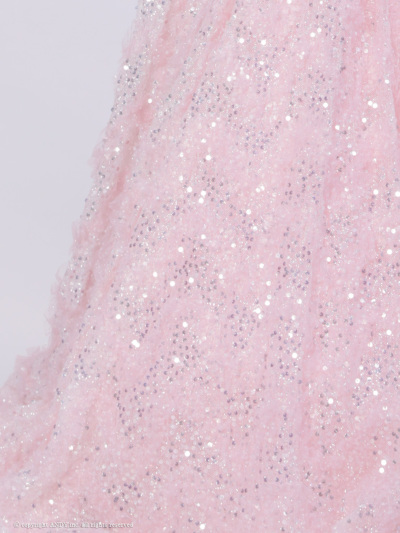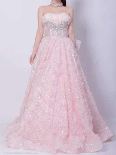 【couture an/クチュール アン】淡いピンクのグリッタードレスは、胸元のフェザーデザインが愛らしさを演出。