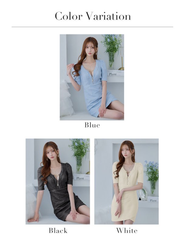 オリジナルカラー・XSサイズあり【IRMA/イルマ】ツイード/ バストジップ/ デコルテチェーン/ 半袖/ 袖あり/ タイト/ ミニドレス/ キャバドレス[OF2A] [55023-IR-BL-S250104]