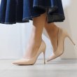 セットバックした極細の10cmピンヒールにシャープなポインテッドトゥが美脚効果をもたらすシンプルパンプス。