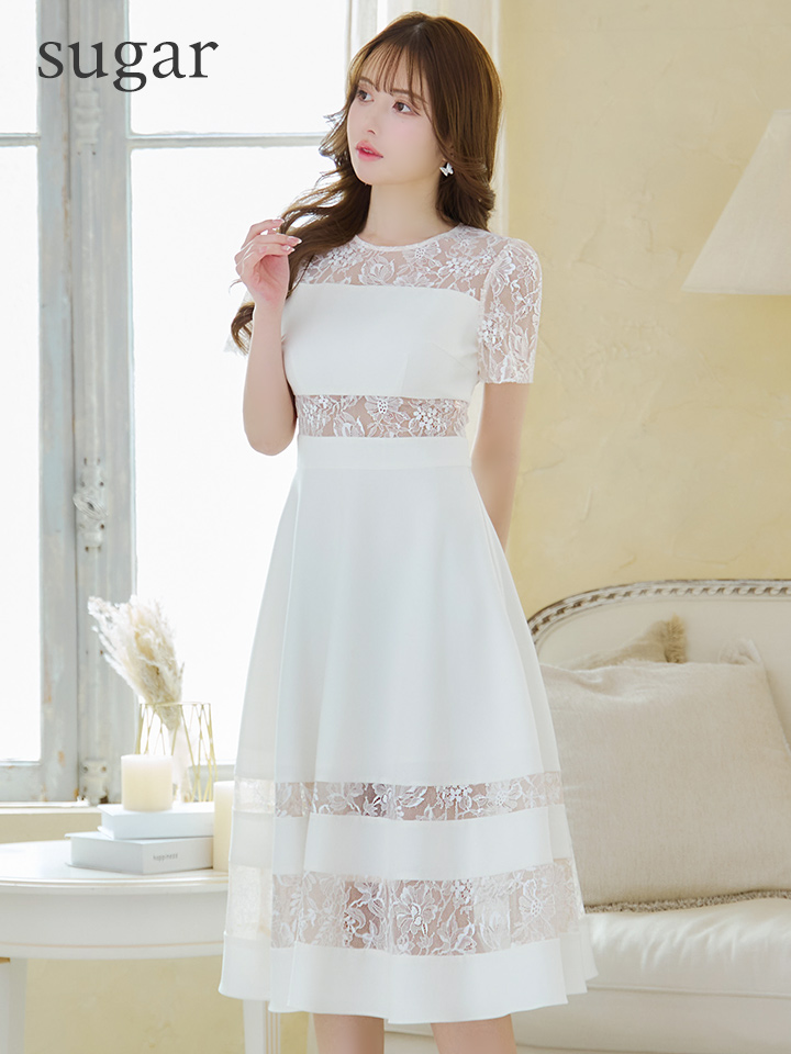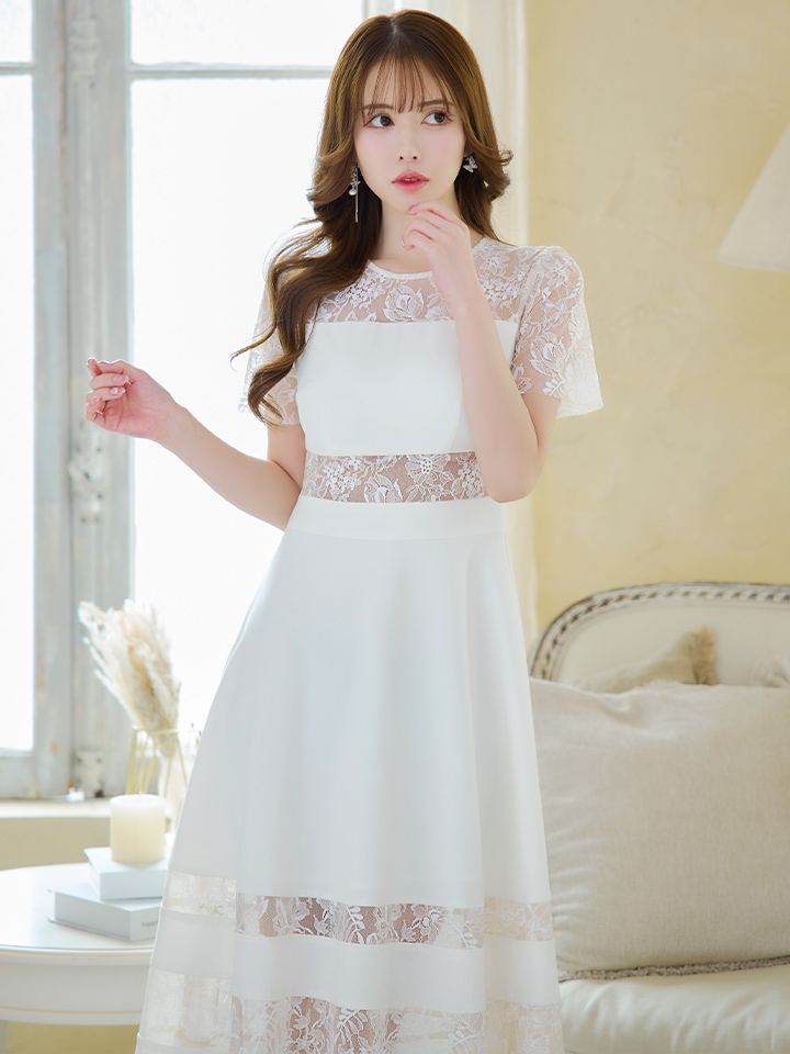 XS-Lサイズあり【ERUKEI エルケイ】レース/ 切替/ 半袖/ 袖あり/ ひざ丈/ Aライン/ フレア/ ワンピース/ ミディアムドレス/ キャバドレス[OF2] [LKE22138-W-S2501]