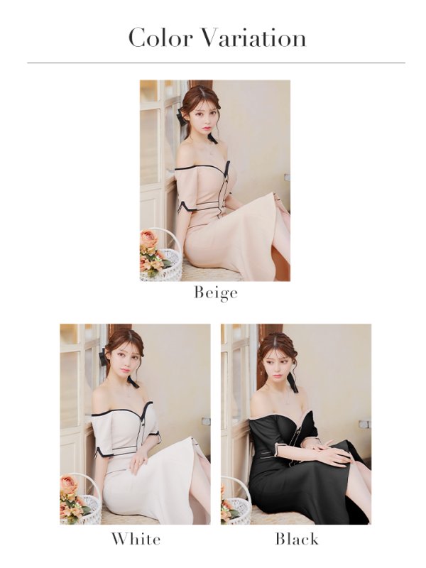 デコルテをすっきり魅せるオフショルダーが大人の色気醸し出すバイカラーミディアムドレス♡
