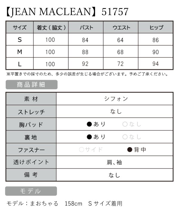 B:86-90 / W:66-70 / H:86-90 [着丈](脇下)約100cm |