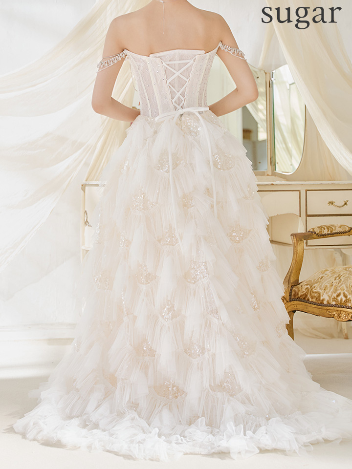 【couture an/クチュールアン】スパンコール/ ビジュー/ ティアード/ オフショルダー/ シアー/ ロングドレス/ エレガント/ ホワイトゴールド/ パーティードレス/ ラグジュアリー/プリンセス/ キャバドレス long[OF05]