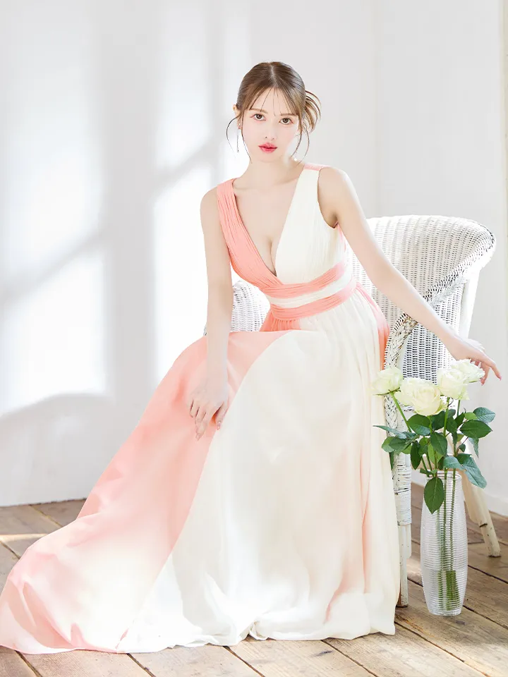 柔らかなシフォン素材のバイカラーが美しいフレアロングドレス♡